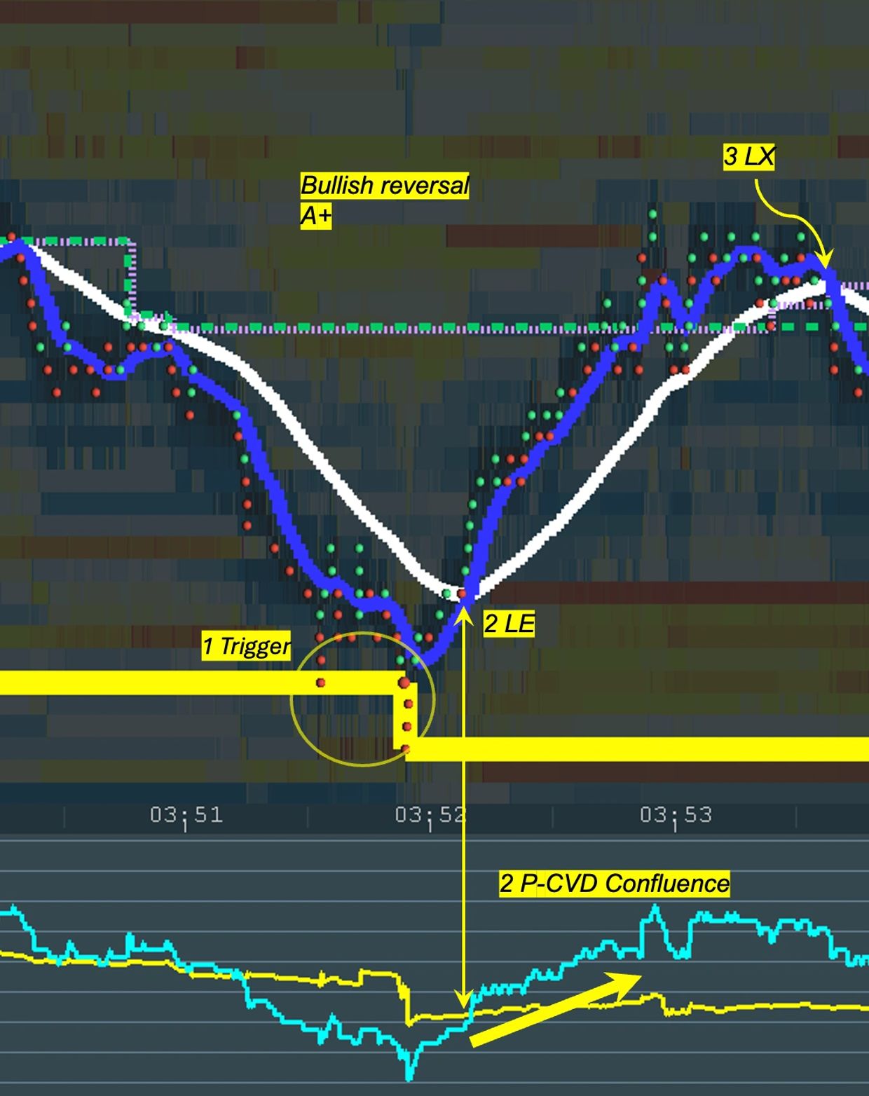 2. LE: Pulse crosses over Core. Subchart price-CVD confluence confirms.